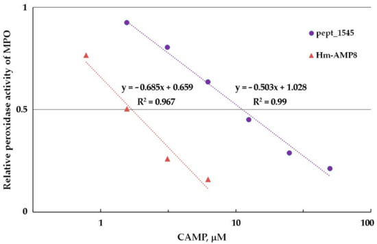 Graphical plot for determination of the half-inhibition concentration (IC50) of pept_1545 and Hm-AMP8 for MPO peroxidase activity. The concentrations were as follows: 8 nM MPO heme, 50 μM Amplex Red, and 25 μM H2O2 in 50 mM K-phosphate buffer, pH 7.4.