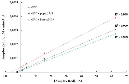 Hanes–Woolf plot illustrating the effect of 20 μM pept_1545 and 2 μM Hm-AMP8 on kinetics of MPO-catalyzed reaction of H2O2 with Amplex Red (n = 3). The concentrations were as follows: 8 nM MPO heme, 25 μM H2O2, and 1 μM– 62.5 μM Amplex Red in 50 mM K-phosphate buffer, pH 7.4.