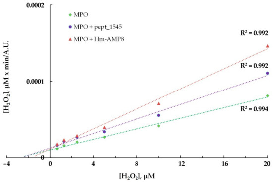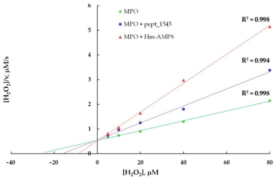 Hanes–Woolf plot illustrating the effects of 8 μM pept_1545 and 0.8 μM Hm-AMP8 on kinetics of MPO-catalyzed reaction of Cl– with H2O2 (n = 3). The concentrations were as follows: 0.8 nM MPO heme, 200 μM CB, 150 mM NaCl, and 5–80 μM H2O2 in 50 mM Na-acetate buffer, pH 5.5.