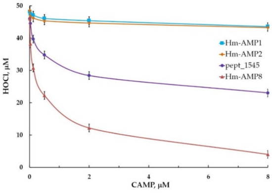 MPO chlorinating activity towards CB and H2O2 in the presence of the cationic antimicrobial peptides Hm-AMP1, Hm-AMP2, pept_1545, and Hm-AMP8 at 0.008–8 μM (peptide/heme molar ratios from 10 to 10,000). The concentrations were as follows: 0.8 nM MPO heme, 200 μM CB, 150 mM NaCl, and 50 μM H2O2 in 50 mM Na-acetate buffer, pH 5.5.