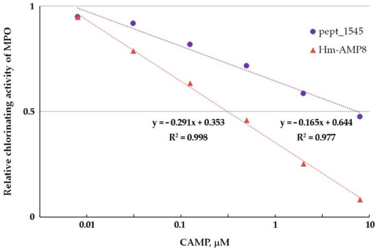 Chlorinating activity is a distinctive feature of MPO as compared with other peroxidases and it is an important property, enabling MPO to combat microbes. We tested whether the inhibitory effects of pept_1545 and Hm-AMP8 on peroxidase activity extend to MPO chlorinating activity. Chlorinating activity was measured using a fluorometric CB-based assay. To determine the concentration dependence of the effect of CAMPs on MPO chlorinating activity, the 0.008–8 μM concentration range (corresponding to 10–10,000 peptide molecules per heme) was used. Hm-AMP1 and Hm-AMP2 produced no significant effect, while pept_1545 and Hm-AMP8 inhibited MPO chlorinating activity similarly to peroxidase activity (Figure 9). The IC50 was 0.3 μM and 7.4 μM for Hm-AMP8 and pept_1545, respectively (Figure 10).