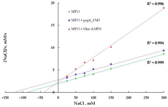 Hanes–Woolf plot illustrating the effects of 8 μM pept_1545 and 0.8 μM Hm-AMP8 on kinetics of MPO-catalyzed Cl– oxidation (n = 3). The concentrations were as follows: 0.8 nM MPO heme, 200 μM CB, 25–300 mM NaCl, and 50 μM H2O2 in 50 mM Na-acetate buffer, pH 5.5.