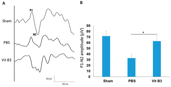 Day 28 following the induction of rAION saw an analysis of the visual circuits (Figure 1A). The P1-N2 amplitudes in the PBS-treated group, the vitamin B3-treated group, and the sham group, respectively, were 71.69 ± 9.10 μV, 32.84 ± 7.62 μV, and 62.9 ± 10.37 μV (Figure 1B). In comparison to the control group, the PBS-treated group’s 2.18-fold significant decrease in the P1-N2 amplitude (p < 0.05) showed deterioration of the visual circuit after ON infarction, whereas the vitamin B3-treated group’s 1.9-fold significant increase in the P1-N2 amplitude (p < 0.05) showed preservation of the visual circuit after vitamin B3 treatment.