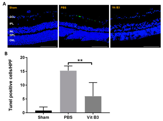 Apoptotic RGCs were detected using the TUNEL assay to further assess the RGC apoptosis in the retina (Figure 3A). In the sham group, the PBS-treated group, and the vitamin B3-treated group, respectively, there were 0.8 ± 1.3/HPF, 15.3 ± 1.7/HPF, and 6.0 ± 5.0/HPF of TUNEL-positive cells (Figure 3B). TUNEL-positive cells were 19.1-fold more prevalent in the PBS-treated group than in the sham group, whereas they were 2.5-fold less prevalent in the vitamin B3-treated group than in the PBS-treated group.