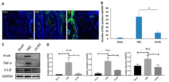 On macrophage infiltration in the ON and inflammation in the retina, vitamin B3 has an anti-inflammatory impact. (A) Pictures of the ONs in longitudinal sections showing ED1 staining. Green markers identified the ED1-positive cells. Blue labels identified the cell nuclei. (B) Counting the number of ED1-positive cells in each HPF. In comparison to the PBS-treated group, the vitamin B3-treated group had a considerably lower number of ED1-positive cells (* p < 0.05; n = 6 per group; scale bar: 100 μm). (C) Typical image of the day 2 following rAION induction Western blotting examination of the retinal material. (D) Measurement of the NF-B, IL-1, and TNF protein bands. Using the iBright imaging program, each value was calculated and normalized to glyceraldehyde-3-phosphate dehydrogenase (GAPDH). NF-B, IL-1, and TNF- expression were all significantly higher in the PBS-treated group than in the sham group, while they were all significantly lower in the vitamin B3-treated group than in the PBS group (* p < 0.05; n = 6 per group). Data were presented as mean ± SD.