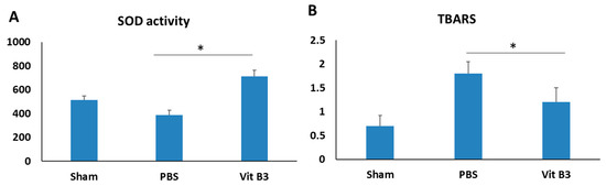 The ON infarction induced oxidative stress that degraded the antioxidant capacity of SOD [27]. Seven days after the infarction, the SOD activity in the PBS-treated group was 1.6-fold lower than that in the sham group (Figure 5A). On day 7 following rAION induction, the vitamin B3-treated group’s SOD activity was found to be 2.2 times higher than that of the PBS-treated group (p < 0.05) (Figure 5A).