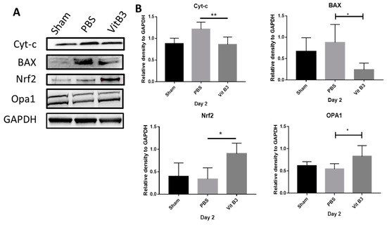 In order to protect cells from oxidative damage, vitamin B3 increased the expression of nuclear factor erythroid-2-related factor 2 (Nrf2) [28]. Furthermore, vitamin B3 enhanced the expression of optic atrophy-1 (OPA1), cytochrome c, and Bcl-2-associated X (BAX), which were important in the modulation of mitochondrial function [29] and apoptosis [30], respectively. The mitochondria-mediated antioxidant potential was further assessed by immunoblot analysis on day 2. This indicated that vitamin B3 decreased cytochrome c and BAX levels by upregulating the antioxidant Nrf2 pathway. The upregulated Nrf-2 further regulated the mitochondrial fusion, which was evident from OPA-1 upregulation on day 2 (Figure 6A).
