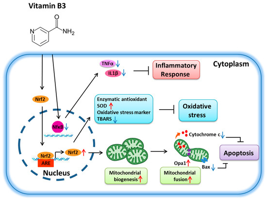 Several studies have demonstrated that vitamin B3 has a favorable safety profile and high dose tolerability, and is affordable, making it easy to translate to small-scale clinical trials, and it also has an excellent history of long-term clinical use [65]. While lowering the expression of BAX and cytochrome c, vitamin B3 dramatically enhanced the expression of Nrf2 and OPA1 (Figure 7). Additionally, vitamin B3 dramatically reduces the activation of NF-κB caused by rAION, which in turn decreases the generation of inflammatory cytokines including IL-1β and TNF-α. There are many neuroprotective mechanisms implicated in response to rAION-induced retinal damage following pretreatment with vitamin B3, including Nrf2 for antioxidative activities and OPA1-BAX-cytochrome c for antimitochondrial apoptosis signaling pathways, as well as NF-κB for anti-inflammatory signaling.