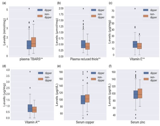 Levels of oxidative stress markers in hypertensive patients with dipper and non-dipper DBP profiles. Box-and-whisker diagram. The horizontal line of the box represents the median and the upper and lower edges represent the 3rd and 1st quartiles (Q), respectively. The edges of the upper and lower whiskers represent the Q3 + 1.5 × interquartile range and Q1 − 1.5 × interquartile range, respectively. The data represented by diamonds are the outliers. (a) Plasma TBARS (nmol/mg). Dipper: 1.08 (0.9), non-dipper: 1.31 (1.0), p = 0.005; (b) plasma reduced thiols (µmol/mg). Dipper: 0.47 (0.3), non-dipper: 0.39 (0.3), p = 0.019; (c) vitamin E (µg/mg). Dipper: 16.1 (10.1), non-dipper: 13.4 (9.3), p = 0.029; (d) Vitamin A (µg/mg). Dipper: 0.75 (0.62), p = 0.032; non-dipper: 0.64 (0.50); (e) serum copper (µg/dL). Dipper: 96.5 (26), non-dipper: 102.0 (24), p = 0.102; (f) serum zinc (µg/dL). Dipper: 98.0 (22), non-dipper: 97.0 (26), p = 0.550. TBARS—thiobarbituric acid reactive substances. ** Refers to p-value lower than 0.05. Results are expressed in median and interquartile range.
