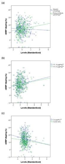 We found a weak positive correlation between the percentage of nDBP dipping and the levels of reduced thiols (Rho = 0.144, p = 0.023), vitamin E (Rho = 0.147, p = 0.023), vitamin A (Rho = 0.156, p = 0.016), and a weak negative correlation with Cu (Rho = −0.127, p = 0.046) levels. We found no relevant results on TBARS levels and the Cu/Zn ratio for the nDBP decrease. Scatter plots in Figure 2 show the correlations between the redox markers and nDBP dipping.