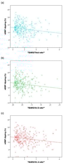 When exploring the relationship between some oxidant and antioxidant variables, we found a weak negative correlation between nDBP dipping and the TBARS/Thiol (Rho = −0.185, p = 0.004), TBARS/Vitamin E (Rho = −0.165, p = 0.012), and TBARS/Vitamin A (Rho = −0.195, p = 0.003) ratios. The results are shown in Figure 3.