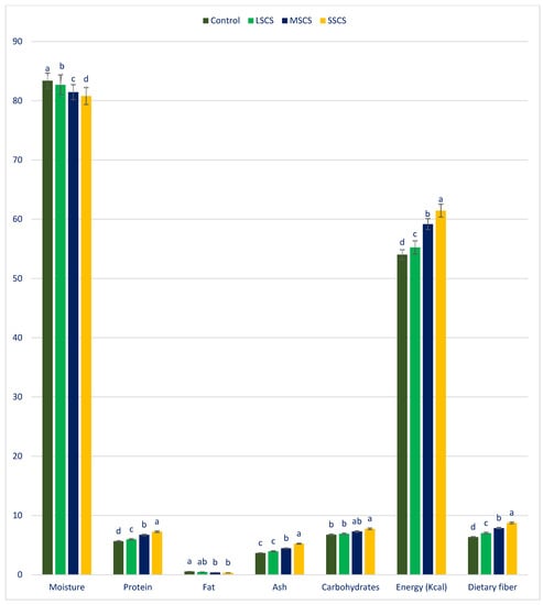 In LSCS, MSCS, and SSCS, dietary fiber, energy, carbohydrates, ash, and protein were increased by 17%, 2%, 2%, 9%, and 4%; 6%, 10%, 8%, 14%, and 19%; and 23%, 14%, 9%, 16%, and 29%, respectively, in comparison with the control condition (Figure 2).