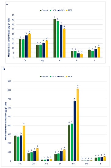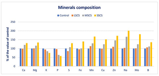 In LSCS, MSCS, and SSCS, Zn, Ca, Cu, Mo, Mg, Mn, B, and Na were augmented by −1%, 0.8%, 13%, −1%, 10%, 4%, 1%, and 6%; 21%, 16%, 29%, 24%, 46%, 67%, 24%, and 12%; and 30%, 34%, 67%, 52%, 72%, 100%, 81%, and 36%, respectively, in comparison with the control condition (Figure 4). In LSCS, MSCS, and SSCS, potassium and phosphorus content declined to 5%, 14%, 25%, and 3%, 36%, 42%, respectively, in comparison with the control condition (Figure 4).