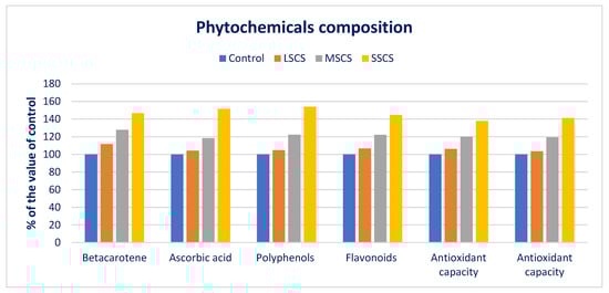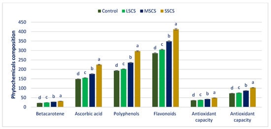 Beta-carotene, AsA, polyphenols, flavonoids, and ARP (DPPH and ABTS+) under LSCS, MSCS, and SSCS were predominately augmented by 12%, 4%, 5%, 7%, 6%, and 3%; 28%, 18%, 22%, 22%, 20%, and 19%; and 47%, 52%, 54%, 45%, 38%, and 41% than control, respectively (Figure 6).