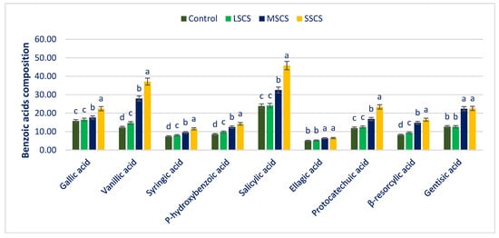 SA, GAA, and PCA contents had no statistical variations at the control and LSCS level; however, three acids were augmented remarkably from LSCS to SSCS with a range from 23.83 to 45.82, 15.76 to 22.46, and 11.95 to 23.42 µg g−1 FW, respectively (Figure 7). In MSCS and SSCS, SA, GAA, and PCA contents were augmented by (37% and 92%), (12% and 43%), and (41% and 96%), respectively (Figure 8). GA and ellagic acid (EA) ranged from 12.68 to 22.58 and 5.08 to 6.55 µg g−1 FW. GA and EA had no statistical variations between control and LSCS levels and between MSCS and SSCS levels; however, the contents of these acids were augmented remarkably from control condition or LSCS to MSCS or SSCS level (26% and 77%) (Figure 7 and Figure 8).