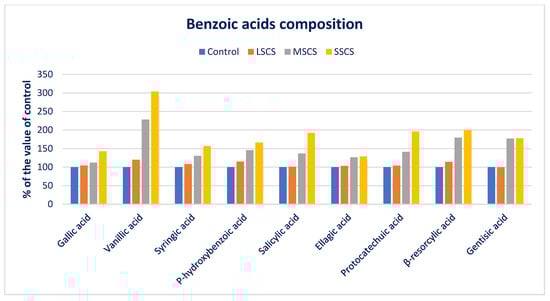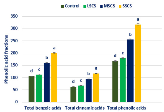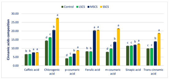 CHA, m-COA acid, and p-COA were progressively augmented in the order of control < LSCS < MSCS < SSCS (Figure 9). In LSCS, MSCS, and SSCS, CHA, m-COA acid, and p-COA were predominately augmented by 13%, 42%, 90%; 25%, 74%, 171%; and 23%, 65%, 110% compared with the control condition, respectively (Figure 10). Trans-CA and SIA contents at control condition were statistically similar to the LSCS level; however, these two acids’ contents were remarkably augmented from LSCS to SSCS with a range from 9.85 to 18.62 and 11.35 to 12.56 µg g−1 FW, respectively (Figure 9). In MSCS and SSCS, Trans-CA and SIA contents were augmented by 41% and 89%; and 6% and 11%, respectively (Figure 10). FA and CFA ranged from 8.20 to 20.45 and 6.56 to 7.62 µg g−1 FW, respectively. FA and CFA contents at the control condition were statistically similar to the LSCS level, and at the MSCS level were statistically similar to the SSCS level. However, the contents of these acids were remarkably augmented from the control condition or LSCS to MSCS or SSCS level (47% and 16%) (Figure 9 and Figure 10).