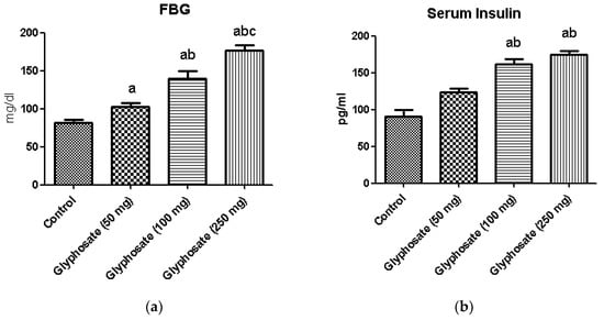 (a–c): The effect of glyphosate on FBG (a), serum insulin (b) and the serum testosterone (c) in control and glyphosate treated rats. Data were expressed as mean ± SEM where n = 6 rats for each group. Values significant at p < 0.05 were analyzed with a—control, b—glyphosate (50 mg/kg b.wt.), and c—glyphosate (100 mg/kg b.wt.).