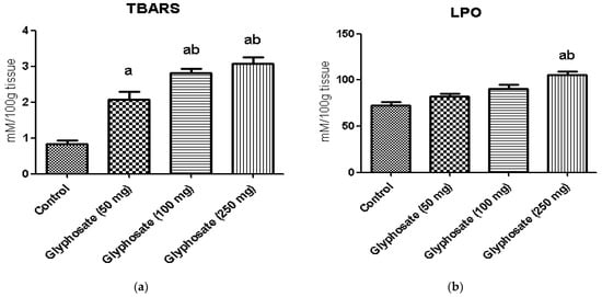 (a,b): The effect of glyphosate on oxidative stress markers (TBARS and LPO) in control and glyphosate treated rats. Data were expressed as mean ± SEM where n = 6 rats for each group. Values significant at p < 0.05 were analyzed with a—control, b—glyphosate (50 mg/kg b.wt.).