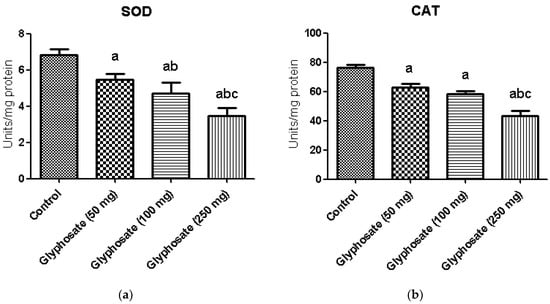 (a,b): The effect of glyphosate on antioxidant enzymes (SOD and CAT) in control and glyphosate treated rats. Data were expressed as mean ± SEM where n = 6 rats for each group. Values significant at p < 0.05 were analyzed with a—control, b—glyphosate (50 mg/kg b.wt.), and c—glyphosate (100 mg/kg b.wt.).