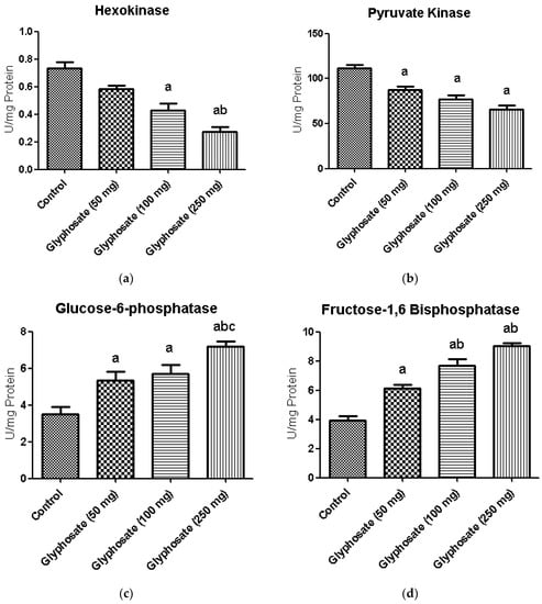 (a–d): The effect of glyphosate on the activity of glycolytic (hexokinase and pyruvate kinase) and gluconeogenic (glucose-6-phosphatase and fructose-1,6-bisphosphatase) enzymes in control and glyphosate treated rats. Data were expressed as mean ± SEM where n = 6 rats for each group. Values significant at p < 0.05 were analyzed with a—control, b—glyphosate (50 mg/kg b.wt.), and c—glyphosate (100 mg/kg b.wt.).
