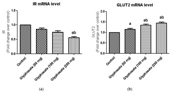 (a,b): The effect of glyphosate on mRNA levels of IR and GLUT2 in control and glyphosate treated rats. IR and GLUT 2 mRNA expression were analyzed by Real Time-PCR using gene specific primers and results were expression in fold-change over control. Data were expressed as mean ± SEM where n = 6 rats for each group. Values significant at p < 0.05 were analyzed with a—control, b—glyphosate (50 mg/kg b.wt.).