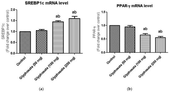 (a,b): Impact of glyphosate on mRNA levels of transcriptional factors like SREBP1c and PPAR-γ in control and glyphosate treated rats. SREBP1c and PPAR-γ mRNA expression were analyzed by Real Time-PCR using gene specific primers and results were expression in fold-change over control. Data were expressed as mean ± SEM where n = 6 rats for each group. Values significant at p < 0.05 were analyzed with a—control, b—glyphosate (50 mg/kg b.wt.).