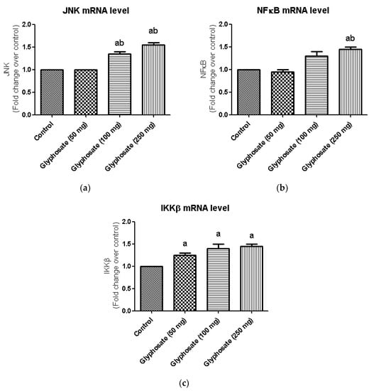 (a–c): Impact of glyphosate on the mRNA expression levels of JNK, NFκB and IKKβ in control and glyphosate treated rats. JNK, NFκB and IKKβ mRNA expression were analyzed by Real Time-PCR using gene specific primers and results were expression in fold-change over control. Data were expressed as mean ± SEM where n = 6 rats for each group. Values significant at p < 0.05 were analyzed with a—control, b—glyphosate (50 mg/kg b.wt.).