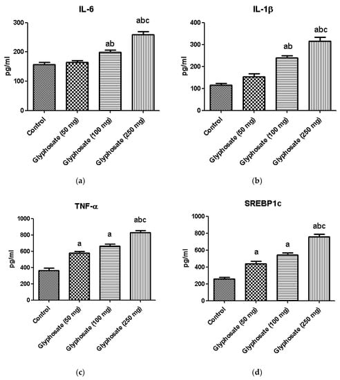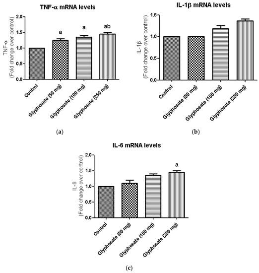 (a–c): The effect of glyphosate on mRNA levels of pro-inflammatory cytokines (TNF-α, IL-1β, and IL-6) in control and glyphosate treated rats. TNF-α, IL-1β, and IL-6 mRNA expression were analyzed by Real Time-PCR using gene specific primers and results were expression in fold-change over control. Data were expressed as mean ± SEM where n = 6 rats for each group. Values significant at p < 0.05 were analyzed with a—control, b—glyphosate (50 mg/kg b.wt.).