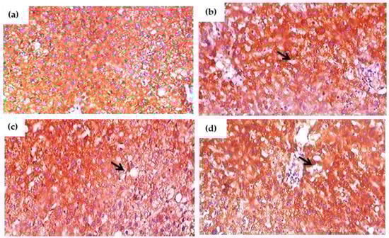 Immunohistochemistry was performed on paraffin embedded liver slices of control and glyphosate-treated rat tissues using a microwave-based antigen retrieval technique. The segments were incubated overnight at 4 °C in a dark, humid chamber with primary polyclonal anti-TNF-α and anti-IL-6 (1:100 dilution) antibodies, followed by 45 min incubation with secondary antibodies under the same conditions. After that, the slides were washed in 1 M PBS to eliminate any remaining secondary antibodies and incubated with horse-radish peroxidase (HRP) for 45 min in a humidified environment before being rinsed for 5 min in 1 M PBS. Then, the slides were incubated for 6 min at 37 °C with the 3,3′-diaminobenzidine (DAB) substrate chromogen 3.3, followed by a 5-min wash in water. The specimens were dried, cleaned and mounted after being counterstained with hematoxylin for 40 s. To ensure the quality of the staining, positive and negative controls were used for each immunohistochemical staining procedure. To establish the overall distribution of the main protein, the cells were initially examined at a modest magnification 100×).