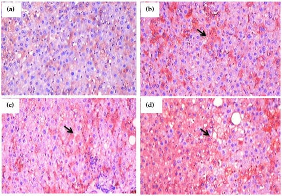 Inflammatory reactions are triggered by the production of pro-inflammatory cytokines such as TNF-α IL-1β, and IL-6 which are linked in the development of a number of metabolic diseases. Hence, we examine the mRNA expression levels of TNF-α, IL-1β, and IL-6 in glyphosate-treated group (Figure 8a–c). In this study, the hepatic mRNA expression levels of TNF-α and IL-6 were increased significantly (p < 0.05) in glyphosate-induced rats when compared to normal rats (Figure 8a,c); whereas, the IL-1β mRNA levels were unaltered in all the groups (Figure 8b).