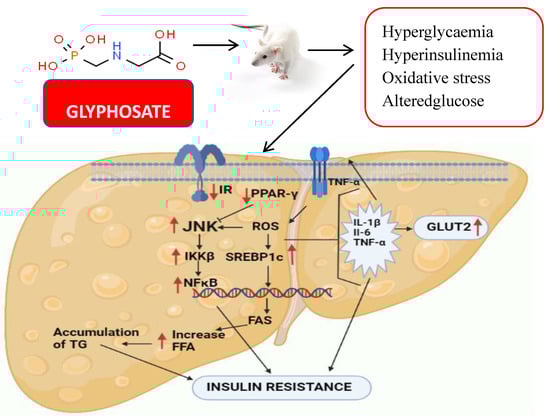 Glyphosate aggravated ROS, altered antioxidant activity, disrupted the glucose homeostasis, altered insulin action in liver via NFκB signaling in liver. As the primary organ for metabolism and detoxification, the liver is affected by oxidative stress caused by glyphosate, which could change crucial regulatory pathways including insulin signalling and JNK, resulting in insulin resistance and inflammation. Further research is needed to understand how glyphosate affects inflammation-related glucose homeostasis, which is important for T2DM/insulin signalling.