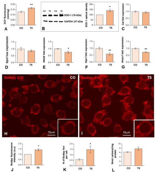 OS reported in DS results from an imbalance between ROS production and the antioxidant system response. Previous studies from our and other laboratories have demonstrated that the hippocampus of the TS mouse is particularly vulnerable to persistent OS [38,46,48]. To better understand the hippocampal OS status of adult TS mice, first, we evaluated ROS production in both groups of animals using an H2DCFDA assay on hippocampal homogenates. The results showed that ROS content was significantly higher in the hippocampi of TS mice compared to the euploid ones (Figure 1A).
