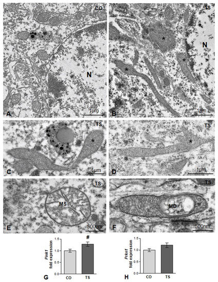 (A,B) Representative electron micrographs from control (CO) (A) and TS (B) GC bodies. Note typical small round or oval mitochondria in the control GC and the presence of larger and polymorphic mitochondria in the TS GC (asterisks). N: nucleus. (C,D) Elongated and polymorphic mitochondria in cell bodies of TS GCs (asterisks). (E,F) Detail of structural alterations in TS GC mitochondria with swelling of the matrix (MS) (E) and focal disruption of cristae (MD) (F). (G,H) RT-qPCR determination of Pink1 (G) and Prkn1 (H) gene expression in hippocampal RNA extracts from control (CO) and TS mice. Pink1 is upregulated, and a moderate but non-significant increase in Prkn1 was detected in TS hippocampi. Data in (G,H) are presented as means ± SEMs of three independent experiments. #: p < 0.05.