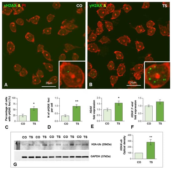 In addition to the phosphorylation of H2AX, the ubiquitination of H2AX (Ub-H2AX) plays an important role in regulating DNA damage response (DDR) and chromatin remodeling [74,75,76]. Therefore, we investigated whether the increased DNA damage in TS GCs correlated with augmented expression of this H2AX PTM. As expected, Western blotting of hippocampal lysates showed a significant increase in Ub-H2AX in TS mice as compared with controls (Figure 3G), suggesting the active role of H2AX ubiquitination in the DDR of GCs.