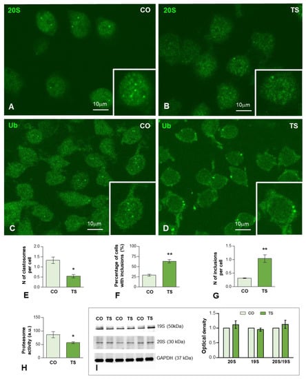 Given that the proteolysis via the UPS is mostly, but not exclusively, of polyubiquitinated proteins, we investigated their subcellular distribution using an antibody that recognizes ubiquitin-protein complexes (Ub-proteins). As illustrated in Figure 4C,D, a diffuse fluorescent signal of Ub-proteins was observed in the nucleus and cytoplasm in both control and TS GCs. Importantly, we found nuclear foci of higher signal intensity, which stood out against the diffuse nuclear fluorescence, particularly in control GCs (Figure 4C, inset). Moreover, bright and sharply defined round aggregates or inclusions of Ub-proteins were found in the cytoplasm of TS GCs (Figure 4D, inset). The quantitative analysis of both the proportion of GCs with cytoplasmic aggregates and the mean number per neuron revealed a significantly higher number of TS GCs as compared with control neurons (Figure 4F,G).