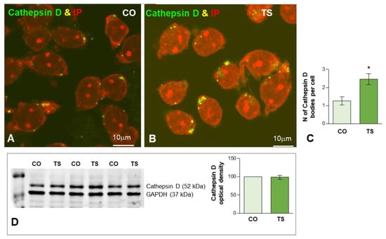 (A,B) Representative images of dissociated GC bodies from control (CO) (A) and TS (B) mice immunolabeled for cathepsin D (green) as a lysosomal marker. Note the greater abundance of cathepsin D-positive cytoplasmic bodies in TS GCs. (C) Quantitative analysis of the mean number of cathepsin D-positive bodies per cell reveals a significant increase in TS GCs. (D) Western blot analysis showing protein expression of cathepsin D in the hippocampi from control (CO) and TS mice. GAPDH was used as the loading control. Non-significant differences were found between the control and TS samples. Data of (C,D) are presented as means ± SEMs of three independent experiments. *: p < 0.05.