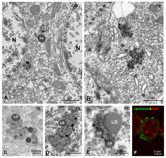(A,B) Representative electron micrographs of control (CO) (A) and TS (B) GCs. Typical electron-dense and homogeneous lysosomes (Ly) appear in control GCs. In contrast, larger and polymorphic lysosomal-related structures containing lipid droplets (LD) were frequently found in TS GCs. (C–E) Detail of large and polymorphic lysosomal-related structures containing electron-dense granules, presumably of proteinaceous nature, and lipid droplets (LD). (F) Confocal microscopy of a TS GC illustrating the presence of autofluorescent lipofuscin granules (green) and counterstained with DAPI (red) for DNA.
