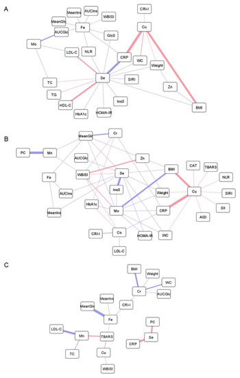 Network representations of Pearson’s correlations between anthropometric and biochemical variables, including parameters related to obesity, inflammation, oxidative stress, glucose and lipid metabolism, and total metal levels in plasma (A), HMM metal species in plasma (B), and LMM metal species in plasma (C). Positive and negative correlations are represented as red and blue lines, respectively (the thicker the line, the stronger the correlation). Abbreviations: AISI, aggregate index of systemic inflammation; AUCGlc, area under the curve for glucose; AUCIns, area under the curve for insulin; BMI, body mass index; CAT, catalase; Co, cobalt; Cr, chromium; CRI-I, Castelli risk index-I; CRP, C-reactive protein; Cu, copper; Fe, iron; Glc0, fasting plasma concentration of glucose; HbA1c, glycated hemoglobin; HDL-C, high-density lipoprotein cholesterol; HOMA-IR, homeostasis model assessment of insulin resistance; Ins0, fasting plasma concentration of insulin; LDL-C, low-density lipoprotein cholesterol; MeanGlc, mean glucose concentration along the oral glucose tolerance test; MeanIns, mean insulin concentration along the oral glucose tolerance test; Mn, manganese; Mo, molybdenum; NLR, neutrophil-to-lymphocyte ratio; PC, protein carbonyl; Se, selenium; SII, systemic immune inflammation index; SIRI, systemic inflammation response index; TBARS, thiobarbituric acid reactive substances; TC, total cholesterol; TG, triglycerides; WBISI, whole-body insulin sensitivity index; WC, waist circumference; Zn, zinc.
