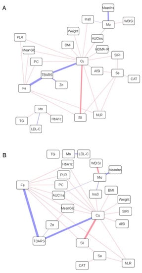 Network representations of Pearson’s correlations between anthropometric and biochemical variables, including parameters related to obesity, inflammation, oxidative stress, glucose and lipid metabolism, and total metal levels in erythrocytes (A) and HMM metal species in erythrocytes (B). Positive and negative correlations are represented as red and blue lines, respectively (the thicker the line, the stronger the correlation). Abbreviations: AISI, aggregate index of systemic inflammation; AUCIns, area under the curve for insulin; BMI, body mass index; CAT, catalase; Cu, copper; Fe, iron; HbA1c, glycated hemoglobin; HOMA-IR, homeostasis model assessment of insulin resistance; Ins0, fasting plasma concentration of insulin; LDL-C, low-density lipoprotein cholesterol; MeanGlc, mean glucose concentration along the oral glucose tolerance test; MeanIns, mean insulin concentration along the oral glucose tolerance test; Mn, manganese; Mo, molybdenum; NLR, neutrophil-to-lymphocyte ratio; PC, protein carbonyl; PLR, platelet-to-lymphocyte ratio; Se, selenium; SII, systemic immune inflammation index; SIRI, systemic inflammation response index; TBARS, thiobarbituric acid reactive substances; TG, triglycerides; WBISI, whole-body insulin sensitivity index; Zn, zinc.