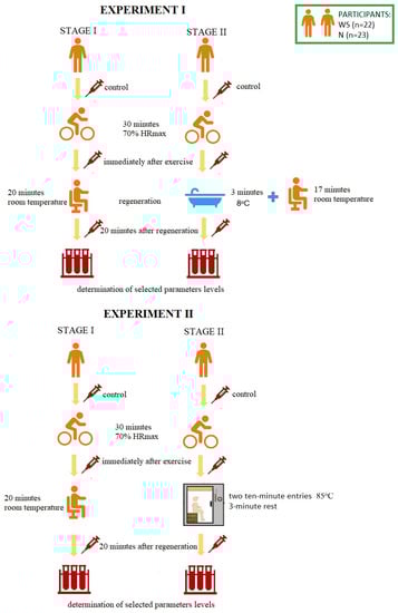 The research was carried out at the Central Research Laboratory of the University of Olsztyn in Olsztyn, Poland and was divided into two experiments. The experiments differed in the method of post-workout regeneration used. In Experiment I it was an immersion in cold water, and in Experiment II it was a sauna treatment. The research was carried out in a cross-over study. Participants were assigned to control conditions (stage I) or to CWI/sauna treatment (stage II) in a cross-sequence (cross-over study). Each participant attended all stages (stage I and stage II during Experiment I, stage I and stage II during the Experiment II). The stages were separated by a week-long break. The scheme of the course of the research is presented in Figure 1.