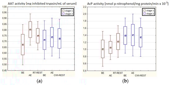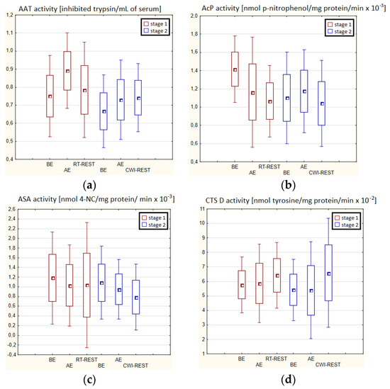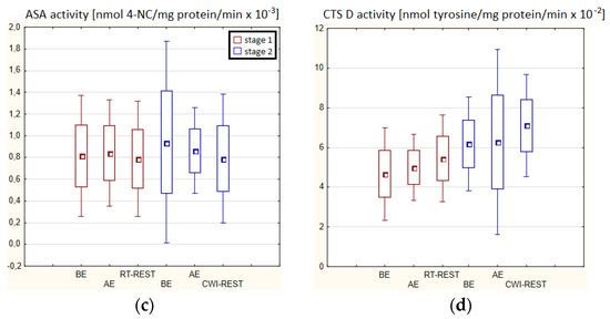 In both stages of Experiment I, no statistically significant changes in AAT and ASA and CTS D activity in the blood serum of winter swimmers after exercise (AE), as well as after exercise followed by the regeneration at room temperature (RT-REST), were found. Comparing the results obtained after RT-REST with the results obtained after the regeneration combined with CWI (CWI-REST), no statistically significant differences in AAT activity and the determined lysosomal enzymes (p > 0.05) were found (Figure 2a–d).