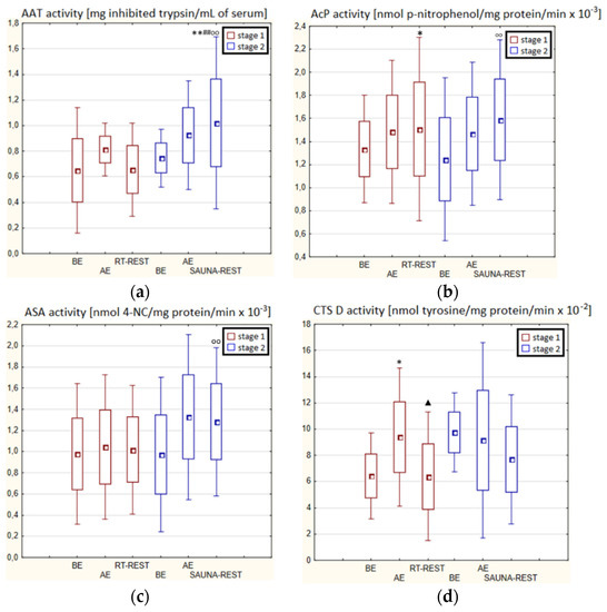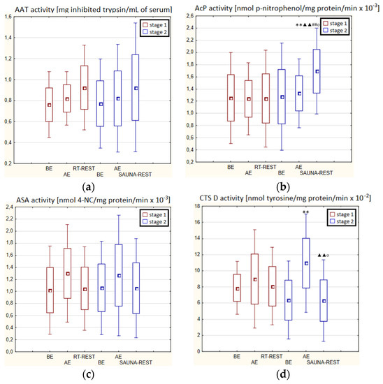 The activities of α1-antytrypsin and lysosomal enzymes in blood serum of winter swimmers (n = 22) in Experiment II: (a) AAT activity; (b) AcP activity; (c) ASA activity; (d) CTS D activity. Data are presented as the mean values ± SD. AAT—α1-antytrypsin, AcP—acid phosphatase, ASA—arylsulfatase, CTS D—cathepsin D, BE—before exercise, AF—after exercise, RT-REST—20-min recovery at room temperature, SAUNA-REST—rest combined with sauna bath, * p < 0.05 vs. BE, ** p < 0.001 vs. BE, ▲ p < 0.05 vs. AE, ## p < 0.001 vs. RT-REST, oo p < 0.001 vs. CWI-REST.