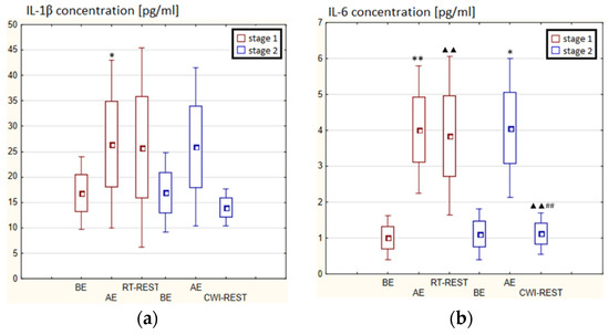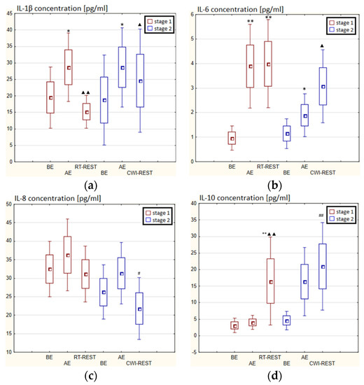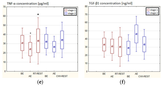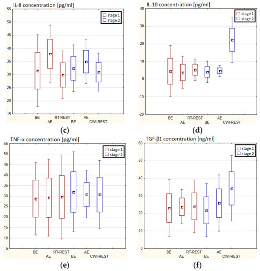 In the first stage of Experiment I, a statistically significant higher concentration of IL-1β (p < 0.05) and IL-6 (p < 0.001) in the blood serum of novices AE than BE was observed. 20 min after RT-REST the concentration of IL-1β was 2-fold lower than AE (p < 0.001), while the concentration of IL-6 20 min after RT-REST was still statistically significantly higher than BE (p < 0.001). A statistically significant increase of IL-10 concentration 20 min after RT-REST compared to the concentration BE and AE was found (p < 0.001) (Figure 8d). The concentration of TNF-decreased by about 26% AE (p < 0.05) versus BE. 20 min after RT-REST, the concentration of this cytokine increased by about 42% (p < 0.05) versus AE (Figure 8e). In this study, no statistically significant changes in the concentration of TGF-β1 and IL-8 AE and after RT-REST were observed (p > 0.05) (Figure 8c,f). In the second stage of the Experiment I the concentration of IL-1β 20 min after CWI-REST was statistically significantly lower (p < 0.05) than AE (Figure 8a). The concentration of IL-6 after CWI-REST was statistically significantly higher (p < 0.05) compared to AE (Figure 8b). There were no statistically significant changes in the concentration of IL-8, IL-10, TNF-α and TGF-β1 AE and after CWI-REST compared to the values BE (p > 0.05) (Figure 5c–f). Comparing RT-REST and CWI-REST, an approximately 31% lower IL-8 concentration (p < 0.05) was observed 20 min after CWI-REST compared to the concentration of this cytokine 20 min after RT-REST (Figure 8c). Moreover, the concentration of IL-10 (p < 0.001) was higher by about 23% after CWI-REST than after RT-REST (Figure 8d). However, no statistically significant differences were observed in the concentrations of IL-1β, IL-6, TNF-α and TGF-β1 (p > 0.05) (Figure 8a,b,e,f) comparing RT-REST and CWI-REST.