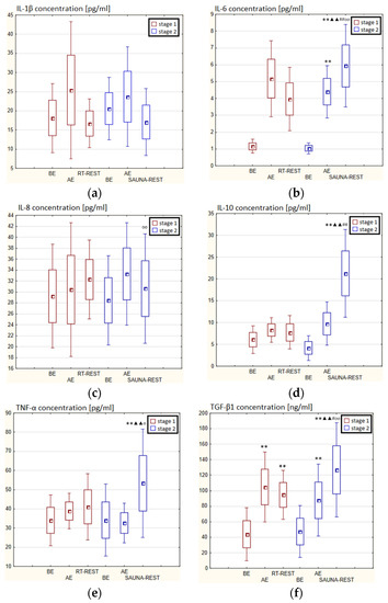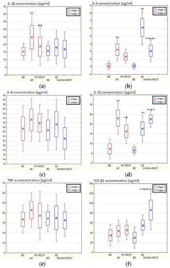 In the first stage of Experiment II a statistically significant increase in the concentration of IL-1β of approx. 60% AE (p < 0.001) versus BE was noted. However, 20 min after RT-REST the concentration of this cytokine was lower by about 25% than AE (p < 0.001) (Figure 7a). There was also a two-fold increase in IL-6 concentration (p < 0.001) (Figure 7b) and a 3-fold increase in IL-10 concentration (p < 0.001) (Figure 7d) AE compared to BE. 20 min after RT-REST the concentration of IL-10 was lower than AE (p < 0.001), but was still twice as high as BE (p < 0.001). No statistically significant changes in the concentration of IL-8, TNF-α and TGF-β1 AE as well as after RT-REST were observed (p > 0.05) (Figure 7c,e,f). In the second stage of Experiment II, a statistically significant 6-fold increase in the concentration of IL-6 was observed AE (p < 0.001) versus BE. 20 min after SAUNA-REST, the concentration of this cytokine was statistically significantly lower than AE (p < 0.001) and still about three times higher than BE (p < 0.001) (Figure 7b). There was also a statistically significant increase in IL-8 concentration 20 min after SAUNA-REST versus AE (p < 0.05) (Figure 7c). Moreover, AE the concentration of IL-10 increased more than 2,5-fold versus BE (p < 0.001). In turn, 20 min after SAUNA-REST, the concentration of this cytokine was higher by approximately 27% than AE (p < 0.05) and approximately 3,5-fold higher than BE (p < 0.001) (Figure 7d). The concentration of TGF-β1 immediately AE was also higher than BE (p < 0.001), and 20 min after SAUNA-REST, as in the case of IL-10, the concentration of this cytokine was statistically significantly higher than AE (p < 0.001) and almost 3-fold higher than BE (p < 0.001) (Figure 7f). There were no statistically significant changes in the concentration of IL-1β and TNF-α (p > 0.05) after SAUNA-REST (Figure 7a,e). Moreover statistically significantly higher levels of IL-10 (p < 0.001) and TGF-β1 (p < 0.001) were observed after SAUNA-REST versus RT-REST (Figure 7d,f). However, no statistically significant differences in the concentrations of IL-1β, IL-6, IL-8 and TNF-α were observed (Figure 7a–c,e).