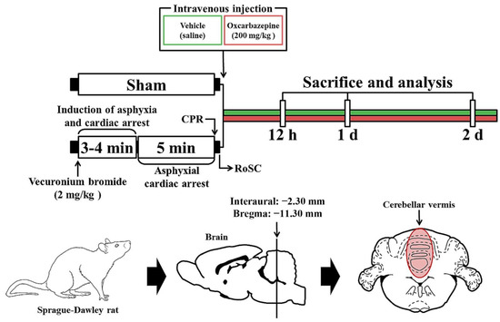 The CA/RoSC operation was performed according to previously published methods [23,24,25] with minor modifications. Briefly, as shown in Figure 1, the rats were anesthetized with 2–3% isoflurane (in oxygen and nitrous oxide: 33 and 67%, respectively) and ventilated to maintain respiration using a ventilator for rodents (Harvard Apparatus, Holliston, MA, USA). Mean arterial pressure (MAP) was monitored in the left femoral artery using an MP150 blood pressure transducer (BIOPAC system, Goleta, CA, USA). Saturation of percutaneous oxygen (SpO2), similar to peripheral oxygen saturation, was monitored using a pulse oximeter (Nonin Medical Inc, Plymouth, MN, USA) connected to the left foot. In addition, the electrocardiogram (ECG) was monitored using an ECG system (GE Healthcare, Milwaukee, WI, USA) which was attached to the four limbs. Body temperature was maintained at 37 ± 0.5 °C during CA/RoSC surgery. In this experiment, CA was induced by asphyxia as follows: After five minutes of stabilization, vecuronium bromide (2 mg/kg; Reyon Pharmaceutical Co., Ltd., Seoul, Korea) was injected via the femoral vein. Immediately, both the anesthesia and mechanical ventilation were stopped, and the endotracheal tube was removed from the ventilator. Asphyxial CA was defined when the MAP was below 25 mmHg and the ECG was isoelectric [24,26]. Usually, asphyxial CA is confirmed approximately three to four minutes after vecuronium bromide injection. After five minutes of CA, cardiopulmonary resuscitation (CPR) was initiated by administering epinephrine (0.005 mg/kg, i.v.; Dai Han Pharm, Seoul, Korea) and sodium bicarbonate (1 mEq/kg, i.v.; Daewon Pham, Seoul, Korea) followed by mechanical chest compression (rate, 300/min) and mechanical ventilation with 100% oxygen until the electrocardiographic activity was shown and MAP reached 60 mmHg [27,28]. Once the rats were spontaneously breathing (usually one hour after RoSC) and hemodynamically stable (usually two hours after CPR), the arterial and venous catheters were cleared. After extubation, the rats were moved to their cages and subcutaneously given isotonic saline (20 mL/kg/d) with 5% dextrose until they could drink and eat by themselves. In this experiment, sham rats were given the same operation except for the CA/RoSC procedure.