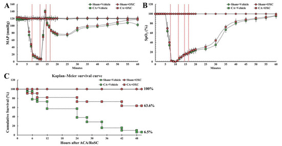 CA/RoSC was confirmed by MAP and SpO2 in all four groups (sham + vehicle, CA + vehicle, CA/RoSC and CA + OXC groups) (Figure 2A,B). The MAP and SpO2 were altered, just as we expected in accordance with the experimental protocol. The survival rate in each group, as shown in Figure 2C, was calculated by the Kaplan–Meier analysis two days after CA/RoSC. The survival rate in the sham + vehicle and sham + OXC groups was 100%; however, the survival rate in the CA + vehicle and CA + OXC groups was 6.5 and 63.6%, respectively.