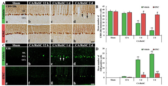 In the sham + OXC group, the distribution of CBD-28k-Purkinje cells was similar to that found in the sham + vehicle group (Figure 3Ae,B), and no FJB-Purkinje cells were found (Figure 3Be,D). In the CA + OXC group, the number of CBD-28k-Purkinje cells was similar to that of the sham + vehicle group at 12 h after CA/RoSC and, at this time, FJB-Purkinje cells were rarely detected (Figure 3Af,B,Cf,D). One day after CA/RoSC, the number of CBD-28k-Purkinje cells was slightly low compared with the sham + vehicle group (Figure 3Ac,B), and the number of FJB-Purkinje cells was significantly decreased compared with that found in the corresponding CA + vehicle group (Figure 3Bc,D). Two days after CA/RoSC, the loss of CBD-28k-Purkinje cells was 85.5% of the sham + vehicle group (Figure 3Ah,B), and the percentage of FJB-Purkinje cells was 17.1% of the CA + vehicle group two days after CA/RoSC (Figure 3Ch,D).