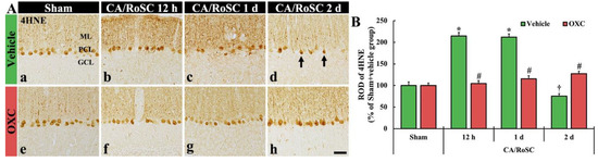 In the sham + OXC group, the immunoreactivity of 4HNE-structures was similar to that shown in the sham + vehicle group (Figure 4Ae,B). In the CA + OXC group, the immunoreactivity of 4HNE-structures was slightly high at 12 h and one day after CA/RoSC compared with the sham + vehicle group. Two days after CA/RoSC, the immunoreactivity of 4HNE-structures was a little high (127.2% of sham + vehicle group) compared with that evaluated in the sham + vehicle group (Figure 4Af–Ah,B).