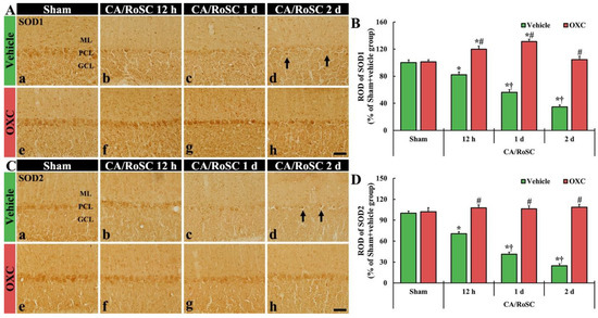 (A,C) SOD1 and SOD2 immunohistochemistry in the cerebellar vermis of the sham + vehicle (Aa,Ca), CA + vehicle (Ab–d,Cb–d), sham + OXC (Ae,Ce) and CA+OXC (Af–h, Cf–h) groups at 12 h and one and two days after CA/RoSC. In the sham + vehicle group, SOD1- and SOD2-structures are Purkinje cells located in the Purkinje cell layer (PCL). In the CA + vehicle group, SOD1 and SOD2 immunoreactivities are gradually decreased after CA/RoSC and are very low (arrows) two days after CA/RoSC. In the CA + OXC group, SOD1 and SOD2 immunoreactivities are not significantly different from those shown in the sham + vehicle group. GCL, granular cell layer; ML, molecular layer. Scale bar = 50 µm. (B,D) Relative optical density (ROD), as a % compared with the sham + vehicle group (100%), of SOD1- (B) and SOD2- (D) structures. The bars indicate the means ± SEM (n = 7, respectively; * p < 0.05 versus sham + vehicle group; # p < 0.05 versus CA + vehicle group; † p < 0.05 versus CA + OXC group).