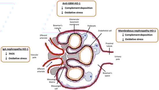 Experimentally induced anti-GBM nephritis has provided plenty of evidence of a co-stimulation of cytotoxic enzymes, such as inducible nitric oxide synthase (iNOS), and cytoprotective molecules, such as HO-1 [46]. iNOS and HO-1 are both hemoproteins that, along with other heme-containing molecules, are upregulated by oxidative stress and inflammation. HO-1 activation, as mentioned above, catalyzes free heme, rendering it less available for synthesis of and tampering with the functionality of heme-containing enzymes, thus blocking the formation of oxidative byproducts [47]. On the other hand, NO seems to upregulate production of HO-1 in mesangial cells [48] and in renal tubular epithelial cells [49] suggesting complicated regulatory interactions between the two systems (iNOS and HO-1) and supporting the potential of HO-1 as a target for innovative future therapeutic strategies [50].